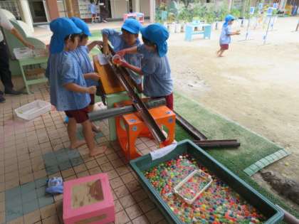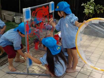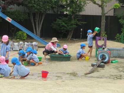 陽気な夏の日差しにウキウキしながら、泥遊びや水遊びを楽しみました。