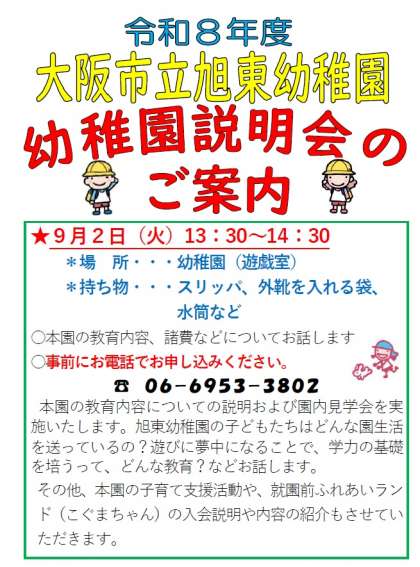 令和8年度 幼稚園説明会のご案内 公開日 2025/07/28 更新日 2025/07/28 お知らせ 9月2日に幼稚園説明会を開催します。参加希望の方は、幼稚園に直接電話(土日祝日除く9時〜16時30分)で申し込んでください。8月12日〜15日は閉庁しています。その他、お尋ねになりたいことがあれば、気軽にお電話してください。お待ちしています。 いいね(0)