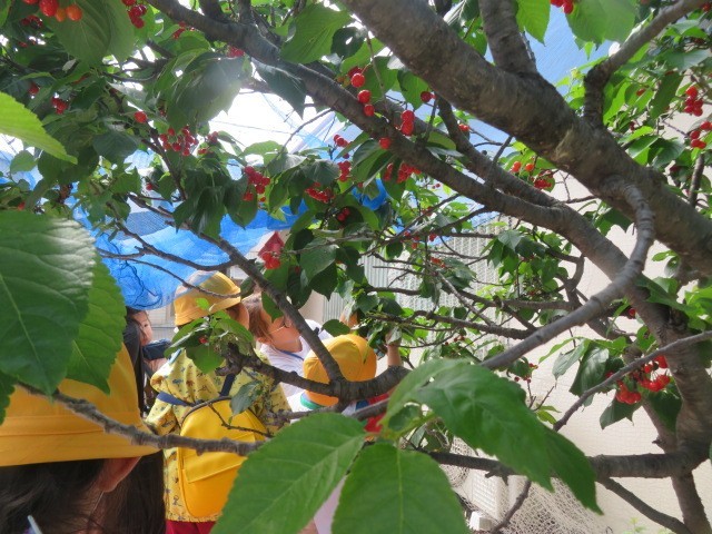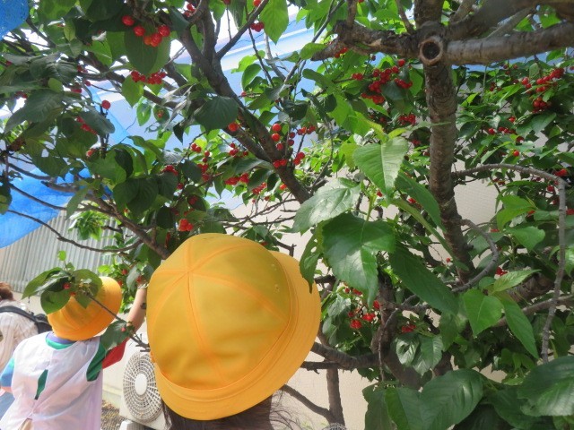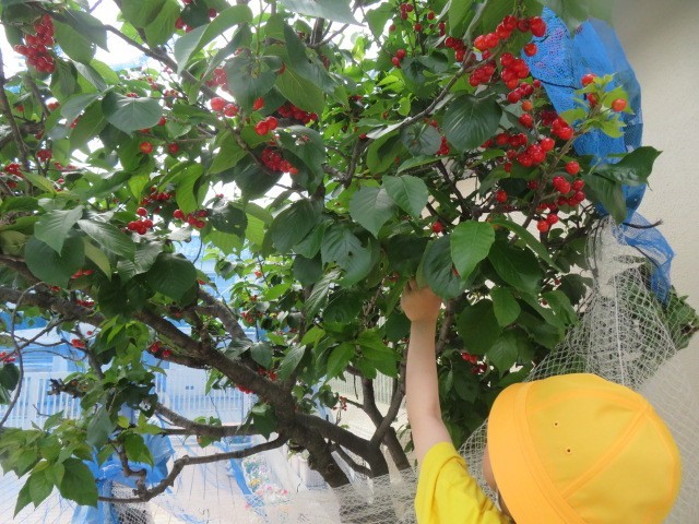 園庭のサクランボが真っ赤に色づきました。「とってもきれい」「可愛いな」「いつの間にこんなに赤くなったのかな?」
