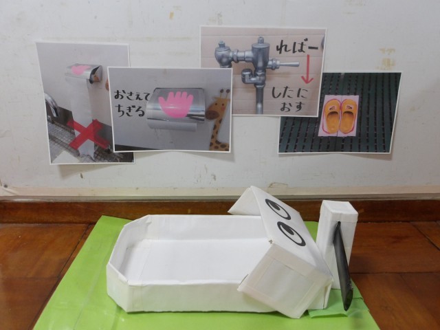 幼稚園にあるトイレ(洋式トイレ、和式トイレ、男児用トイレ)の写真を見せ、和式トイレの使い方を伝えました。その後、段ボールで作った和式トイレにまたがる練習をしました。また、みんなで気持ちよくトイレを使うために、ペーパーホルダーの蓋を押さえて切ることやトイレをきちんと流すこと、スリッパを揃えることも大切であると知らせました。