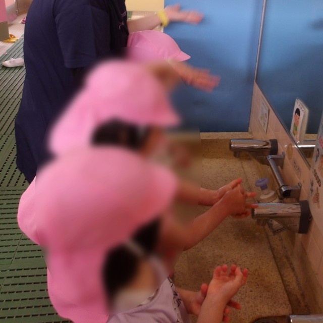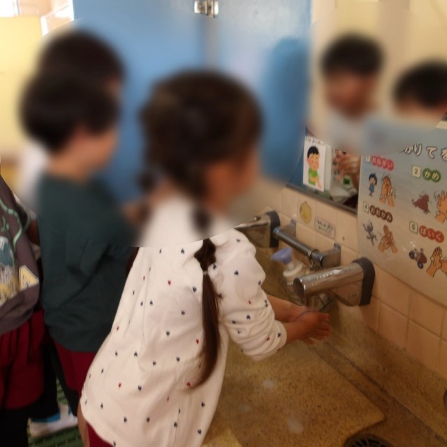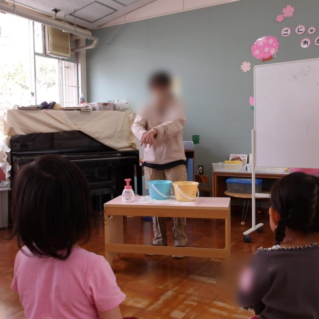 ばい菌は手に付きやすく、そのままの手で食べ物を食べてしまうと病気になってしまうことを伝えました。ばい菌を体の中に入れないために、石けんを使ってしっかりと手をこすって洗うことが大切であると知らせました。また、手洗いのタイミング(外から帰った後、遊んだ後、生き物を触った後、トイレの後、食事の前)を伝え、1日に何回も手洗いをすることで病気を予防できることを伝えました。
