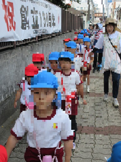4歳児にとっては初めてのお散歩でしたが、5歳児が手を引いて優しくリードしてくれたので、最後まで頑張って歩いていました。