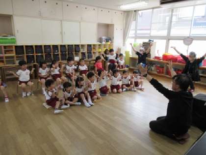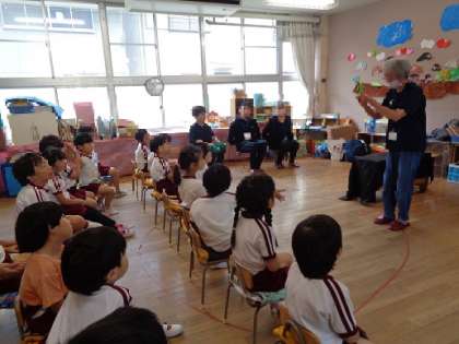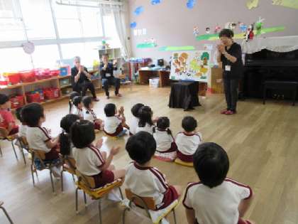 今日は城東絵本の会の方が来てくださり、絵本の読み聞かせや手遊びを一緒に楽しみました。子どもたちはカエルの手袋人形と一緒にカエルの歌の輪唱にも挑戦しました。パネルシアターでは色々な動物が登場して大喜びの子どもたち。「楽しかった」の感想がたくさん聞こえてきました。最後は感謝の気持ちとともに、「またきてくれますように」と思いを込めてお礼の言葉を伝えていました。