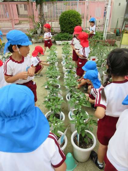 「トマトが緑!」「あかちゃんピーマンある!」「ナスのお花がきれい!」と友達と感じたことを伝え合っていました。