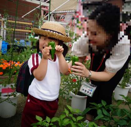 大きくなった野菜を見つけて、お家の方と一緒に収穫です。