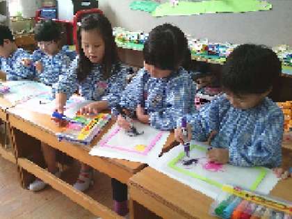 友達とペンを譲り合って使ったり、絵を見せ合ったりして楽しくかいた後は、そのプレートを的にして水鉄砲で遊びました。
