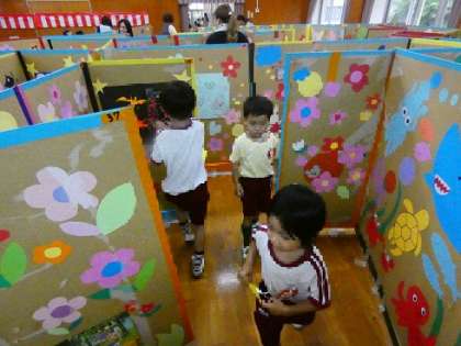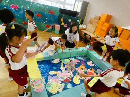 有志の保護者の方が前日から準備をして下さり、今日は子どもたちと縁日ごっこを楽しみました。いつもとは違う幼稚園のお祭りの雰囲気に、昨日から「はやく遊びたい」とワクワクしていた子どもたち。保護者の方がタンバリンを鳴らしたり声をかけたりしながらたくさん盛り上げて下さり「やったー」「もう一回やる!」と子どもたちも夢中になって遊んでいました。