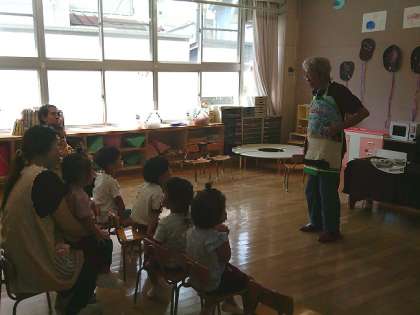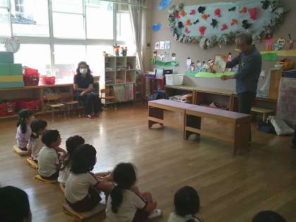 今日は「城東絵本の会」の方が来てくださって、楽しい絵本読みと手遊びやエプロンシアターをしてくださいました。