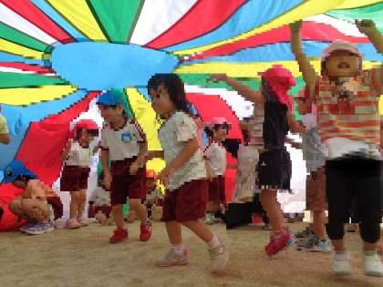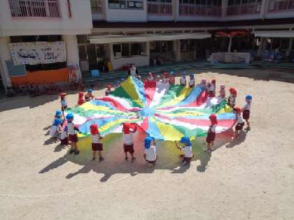 今日は全園児となーちゃんクラブ(未就園児)のお友達と一緒に、5歳児の運動会プログラムの一つでもあるパラバルーンで遊びました。4歳児となーちゃんクラブのお友達(未就園児)もとても楽しそうで、パラバルーンの中に入ると「やったやったー」「すごいねぇ」と大喜びしていました。