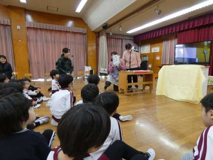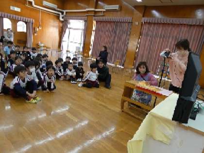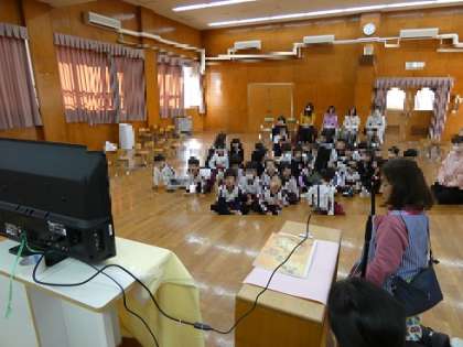 先生の出し物で、カメラを使って絵本をみました。普段の読み聞かせとは違い、テレビに映る絵本に興味津々の子どもたち。登場人物のねずみや食べ物などを探しながら真剣に見ていました。お話だけではなく、絵を見てみんなでいろいろなことを発見する楽しさを味わいました。