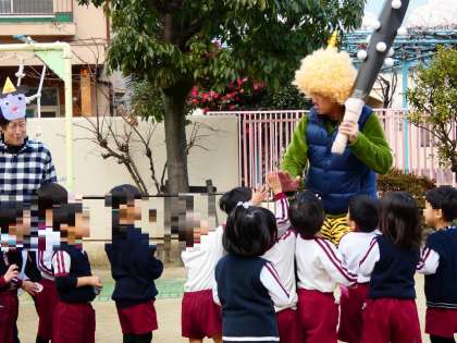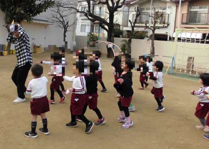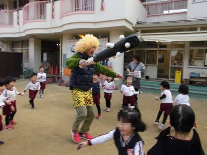 担任が鬼役をしていると、どこからか、大きな鬼がやってきて大興奮