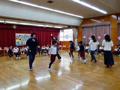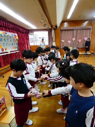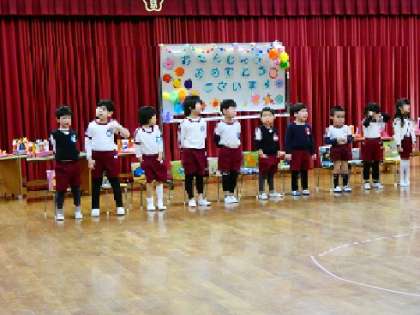 3月の誕生会があり、無事に全員誕生日をお祝いすることができました。最初に好きな入場の仕方で入場し、自己紹介をします。みんなの前に立つとドキドキな様子の子どもたちでしたが、自分の言葉で一生懸命伝えようとする持ちが伝わってきました。最後は、みんなの誕生月に合わせて、スキップしたりポーズをとったりしてお家の人も一緒に楽しみました。