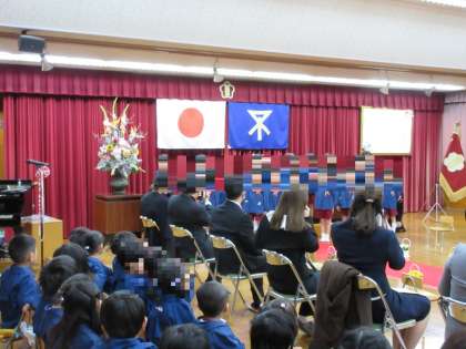 そら組(5歳児)が、うめ組(4歳児)や保護者、来賓の方々に祝われて巣立っていきました。