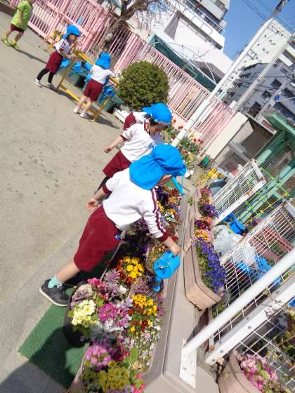 チューリップや色とりどりの花の水やりも楽しみました。
