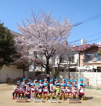 進級児(そら組)が新しい青色の帽子をかぶり、満開の桜の下で元気に遊びました。