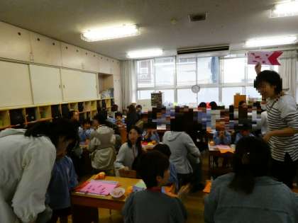 こいのぼりで遊んで親しんだ後、自分のこいのぼりをつくり、もう1つのこいのぼりは保育参観でお家の人とつくりました。
