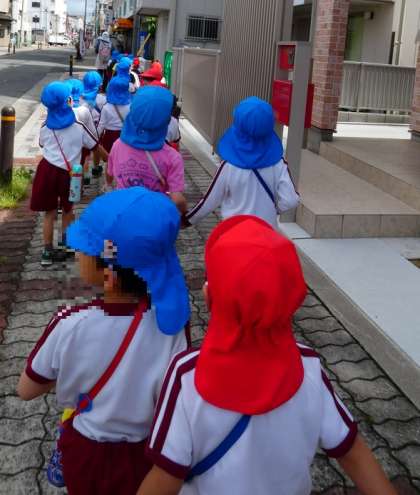 涼しい過ごしやすい日に、うめ組(4歳児)とそら組(5歳児)で公園までお散歩に行きました。友達と手をつないで、危なくないように道の端を歩いたり、信号をしっかり見たりして交通ルールも学びました。