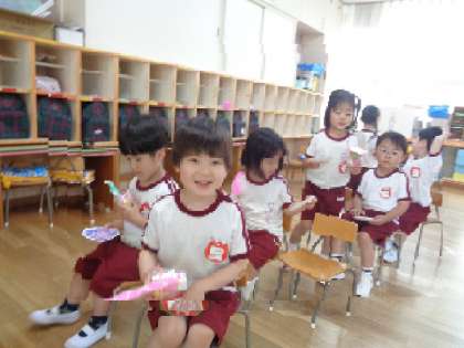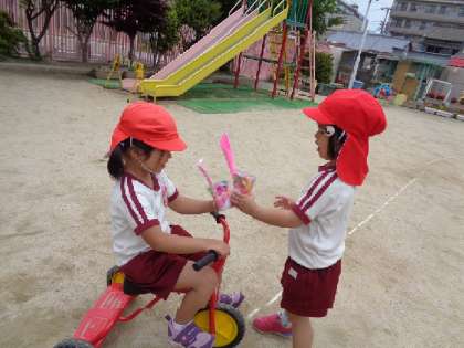 初めてハサミを使いました。赤色の画用紙はイチゴ、黄色はバナナやレモンなど、色々な果物に見立てながらジュースをつくりました。完成すると嬉しくて園庭に持って行き、その都度「かんぱーい」とジュースタイムが始まります。お部屋でも椅子を並べて「みんなでジュースタイムにしよう!」と粘土でピザもつくったりしながら楽しんでいます。
