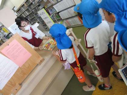 城東図書館のご厚意で、園児1人ずつ、貸し出し経験をさせていただきました。「お願いします」「ありがとうございます」も、伝えることができました。本当に貴重な体験をさせていただいたと思います。ありがとうございました。