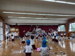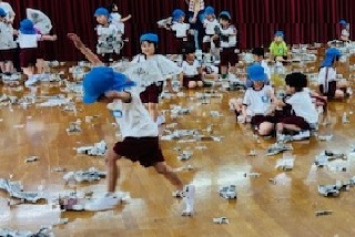 雨の日が続いていたので広い遊戯室で新聞紙をマントやスカートに見立てて遊んだり、たくさんちぎったりして存分に遊びました。ちぎった新聞紙を上に投げ「雪みたい」と何度も楽しんでいました。最後に遊んだ新聞紙を袋に集めて『てるてる坊主』をつくりました。晴れてたくさん園庭でも遊べますように!