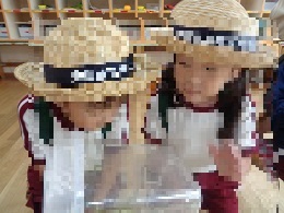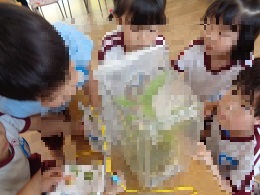 園庭で見つけた黄色の卵。『なんの卵なのかな?』と育ててみるとアオムシがうまれてきました。そら組(5歳児)はもっている自分の図鑑で調べてみたり、うめ組(4歳児)は、はらぺこあおむしの絵本とかさねてみたりして、成長を楽しみにしています。