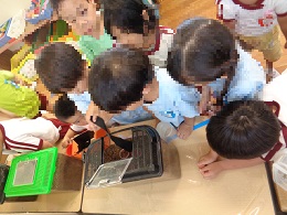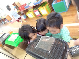 毎日サナギを見ては「まだ生まれないね」「これは何になるのかな〜」と楽しみにしていた子どもたち。今日朝登園してくると「カブトムシー!!」「生まれてる!カブトムシになってる!」とみんな教えあって大興奮していました。「早くご飯をあげないとお腹がすいちゃうよ」とゼリーを入れて観察タイム。「かっこいね」「あ!ひっくり返ってる!助けてあげないと」と愛情いっぱいみんなで観察したりお世話したりしていました。