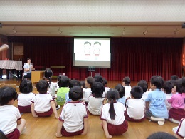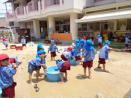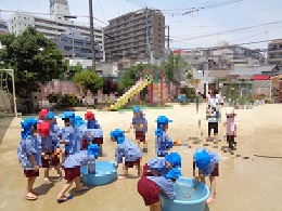 来週プール開きの前に、プールごっこをしました。水着に着替える前に、養護教諭からプライベートパーツについてのお話も聞き、自分の体を大切にしようとする気持ちももったようでした。プールごっこの後はみんなで園庭に出て、水鉄砲をしたり、ペットボトルシャワーをしたりして遊びました。「気持ちよかったね」「早くプールに入りたいね」と楽しみにしている声もたくさん聞えてきました。