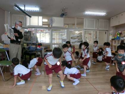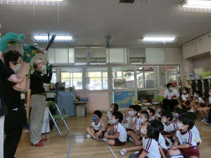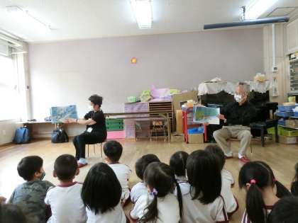 城東絵本の会の方が来てくださり、絵本やペープサートを楽しみました。特に4歳児(うめ組)の子どもたちが盛り上がった絵本はエリック・カールさんの「できるかな」の絵本で、動物たちの真似をして楽しんでいました。5歳児(そら組)は最後にカエルの歌の手袋人形でみんなで輪唱にも挑戦しました。