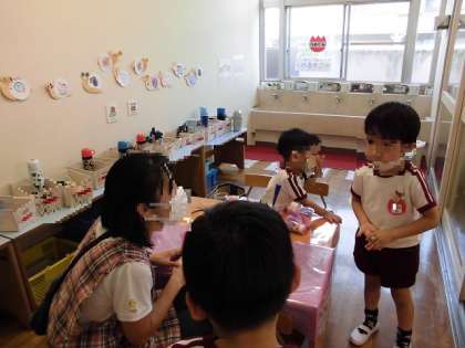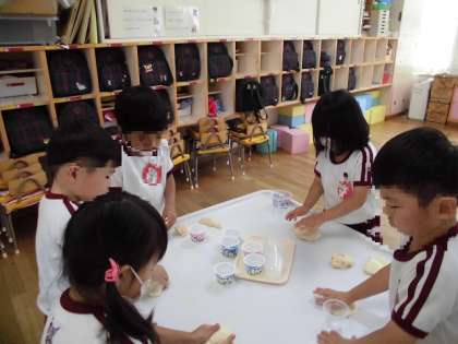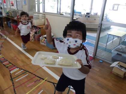 小麦粉ねんどで遊んでいます。「やわらかい!」「なんかいい匂いがする」「冷たい!」等と小麦粉ねんどの感触を楽しんでいました。遊んでいるうちにカップの中に入れたり、お皿やトレーに乗せたり、棒に刺したりして「お好み焼きでーす」「クッキーできたよ」「りんご飴美味しいよ!」等と見立てて遊ぶようになっていきました。テーブルを用意するとそこはレストランになりました。「いらっしゃいませ」「〇〇ください」等と、お店屋さんやお客さんになりきって、先生や友達とごっこ遊びを楽しんでいます。