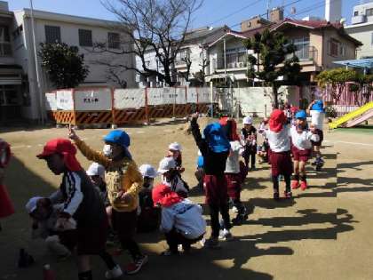 5歳児のお兄さん、お姉さんはもうすぐ修了式を迎えます。そこで4歳児が、お別れ会を開きました。お別れ会の最初は、4・5歳児混合でリレーをしました。