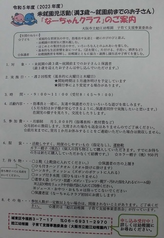 ☆令和5年度 未就園児活動「なーちゃんクラブ」の申し込み受付中!