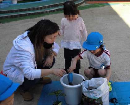 お家の方と一緒に、夏野菜(ミニトマト、ピーマン、ナス)の苗植えをしました。これから水やりをしながら生長を見守っていきたいと思います。大きくなって美味しい野菜がたくさん収穫できますように!