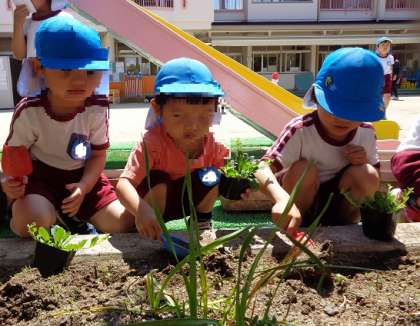 年長児のそら組がペチュニアの苗植えをしました!なかなか花の名前が覚えられないようで「ペペぺ・・・?」等といろいろ言っていました。花が咲く頃には覚えられるかな?何色の花が咲くのかも楽しみです!