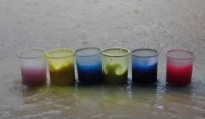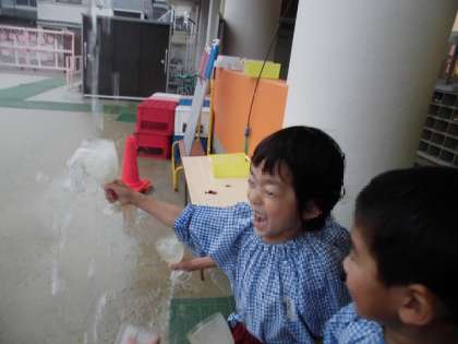 大雨が降ってきて、「わーすごい雨や!!」「ここから水がいっぱい落ちてきてる!」と大騒ぎに。テントの端に貯まった雨が流れてきているところに手を差し出して「すごい水強い!」、水遊び用のコップを持ってきて水を受けて「わー!めっちゃすぐ貯まる!」「飛び出す!」と喜んだり面白がったりしていました。大雨も子どもたちにとっては遊びの一つですね。