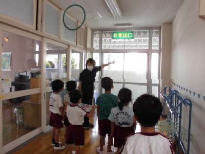 7月末の避難訓練(火災)では今年度初めて2階の階段を使い避難しましたが、みんな慌てず落ち着いて行うことができました。そのあと非常出口の場所もみんなで確認しました。