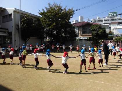 運動会が終わった後、そら組(5歳児)と、うめ組(4歳児)が一緒に、お互いのプログラムの遊びを楽しみました。