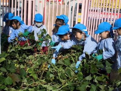 幼稚園の小園庭にある畑で、サツマイモの収穫をしました。