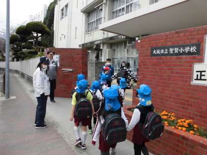 4歳児うめ組が「いってらっしゃい!」と見送ってくれて、そら組の子どもたちは、はりきって園を出発しました。小学校の校門前で先生方が出迎えてくださっていました。少しドキドキしながら小学校に入って行きました。