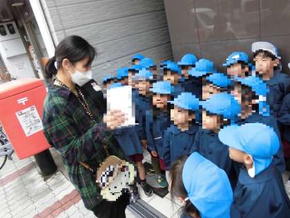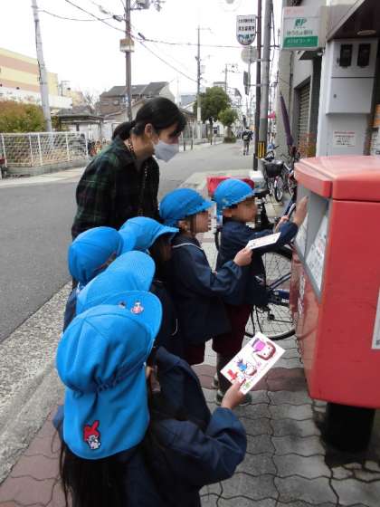 5歳児のそら組が4歳児の年賀状も預かって、幼稚園の近くのポストに投函しに行きました。