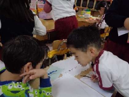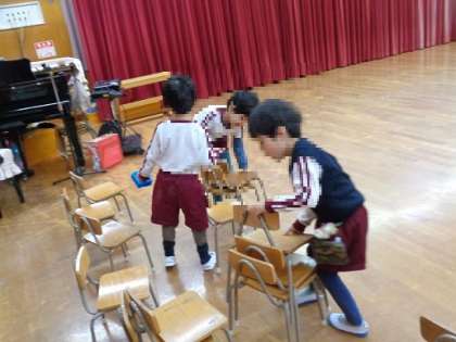 お別れ会に向けて、4歳児うめ組が「どんなお別れ会をしようか」と相談して、自分たちで5歳児のそら組に楽しんでもらえるようなゲームを考えて、チームごとにいろいろ準備をしてきました。ゲームの準備や司会の言葉など、いちから自分たちで考えてつくり、当日を楽しみにしながら取り組んでいました。
