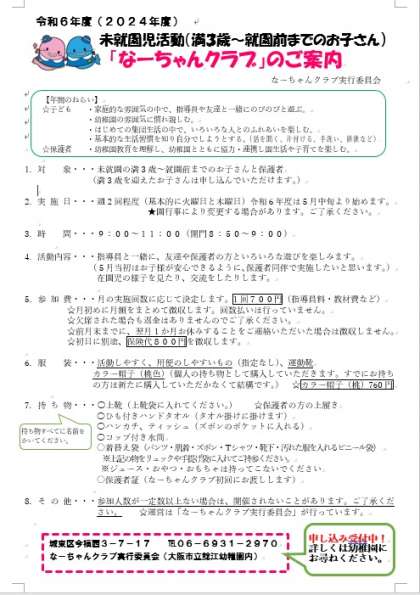 令和6年度 なーちゃんクラブ 公開日 2024/04/01 更新日 2024/04/01 お知らせ 令和6年度 なーちゃんクラブ(満3歳から就園前まで)を募集しています。 なーちゃんクラブのご案内データはこちらまで 申込書はこちら 詳しくは鯰江幼稚園06−6931−2970まで問い合わせてください。 いいね(0)