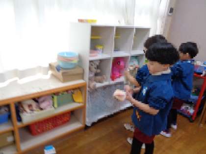 入園式では、進級したそら組の子どもたちが新しいお友達のために楽しい出し物を用意しました。入園式に向けていろいろ考えていると、「掃除もしたい!」と子どもたちから提案があり、急遽うめ組やそら組のロッカーやままごとの棚なども綺麗にしてくれました。