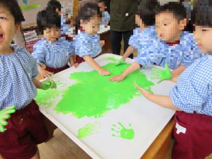 4歳児うめ組が「指絵の具」で遊びました。