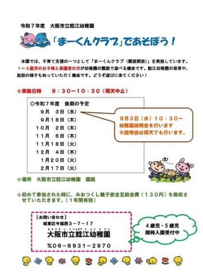 まーくんクラブの後期日程が決まりました 公開日 2025/08/07 更新日 2025/08/07 お知らせ 未就園児園庭開放「まーくん」クラブの後期日程が決まりました。 1〜3歳のお子さんと保護者の方が対象です。初めての方も大歓迎。 どうぞ遊びに来てください。 いいね(0)