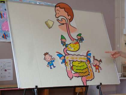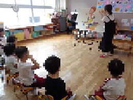 8月29日、城東区役所の保健師さんが来てくださり、生活習慣「うんちのはなし」をしてくださいました。子どもたちはどうやって『ばななうんち』がつくられるか教えてもらうと、「よくかんで食べる!」「好き嫌いしないで食べる!」と張り切っていました。