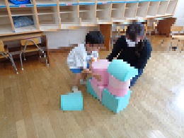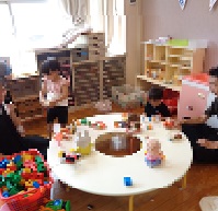 今日はまーくんクラブ(未就園児園庭開放)のお友達と一緒に遊びました。お部屋でおままごとやソフト積み木をしたり、園庭でスーパーボールすくいをしたりして遊びました。