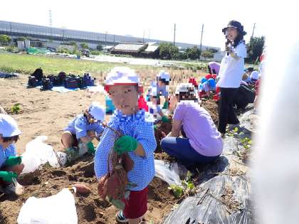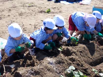 芋畑では、土を掘っているうちに顔を出した芋を見て「うわぁ!お芋見えたよ!」と声をあげ、さらにどんどん掘り進めて芋が抜けると「やったぁ、見てみて!」ととてもうれしそうに見せてくれました。