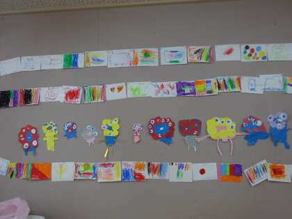 万博のイメージで遊んできた『ミャクミャクワールド』では、色々な運動遊びを子どもたちと考えて遊んできました。ミャクミャクに変身してハンドルの技を披露する時の顔は真剣で拍手をもらうと嬉しそうにしていました。最後の大繩くぐりぬけでは、自分が成功すると友達のことも応援する姿がありました。運動会の取り組みを通して自分だけでなく友達のことも考えて声を掛ける姿が見られるようになってきました。