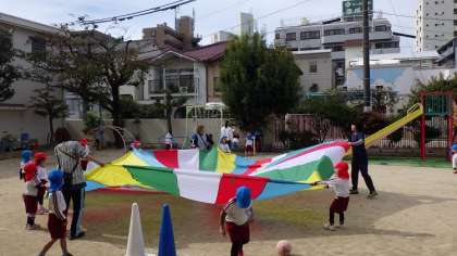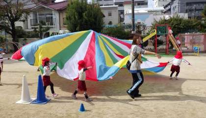 外遊びの時間に、そら組(5歳児)が運動会で行ったパラバルーンをうめ組(4歳児)が遊んでいました。念願のパラバルーンができて、とてもキラキラした笑顔で喜んでいました。