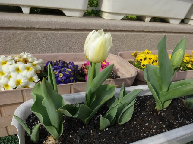 うめ組(4歳児)さんが植えていたチューリップ第1号が咲きました。